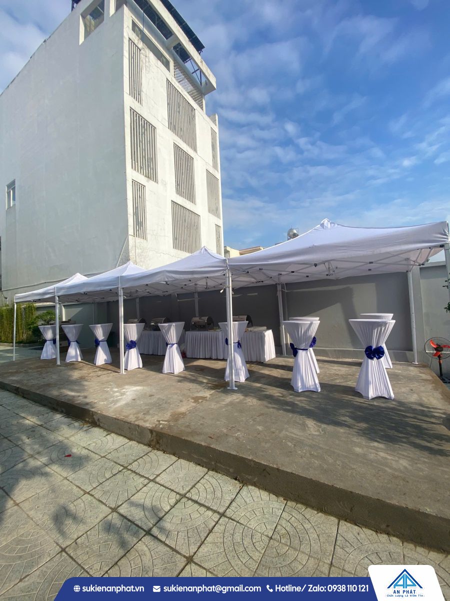 Che chắn & Nội thất: Nhà bạt không gian, dù che, bàn ghế đại biểu (bàn chữ nhật, ghế banquet bọc nơ), bàn bar đứng (cocktail table).